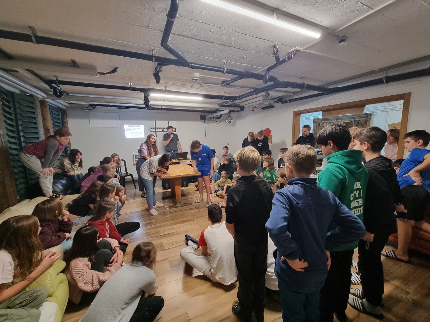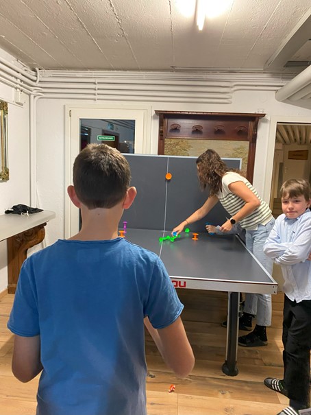 Ungefähr um 19:45 haben wir uns im Partyraum besammelt. Dann ging es los. Das erste Spiel hiess «Grimassenschneiden». Da musst man einen Keks mit Gesichtsmuskeln und Grimassen in seinen Mund transportieren. Beide Gruppen bekamen einen Punkt. Das nächste Spiel hiess «Frosch hüpfen». Beim Spiel Frosch hüpfen hat der gewonnen, wer als Erster dreimal, denn Frosch in die Kiste traf. Die Mädchen haben gewonnen und 3 Punkte gekriegt. Danach kam ein Gruppenspiel. Wir mussten die Namen der Promis erraten. Die Jungs haben 8 Punkte erreicht und die Mädchen haben 7 Punkte erreicht. Das nächste Spiel war «Einlochen». Da musste man Kugeln in eine PET-Flaschenöffnung treffen. Die Jungs haben gewonnen und 2 Punkte gekriegt. Das nächste war «Flaschenjongleur» bei diesem Spiel gewinnt derjenige, der als erster drei Bottleflips schaff. Die Mädchen haben gewonnen und 2 Punkte gekriegt. Danach kam noch ein Gruppenspiel. Wir mussten Emojis zu einem Weihnachtslied erraten. Die Jungs hatten 7 Punkte und die Mädchen 6 Punkte. Als nächstens kam das Spiel «Triff den Korb». Die Mädchen haben 2 Punkte gekriegt. Das letzte Spiel hiess «Kartenhaus bauen». Wer das höchste Kartenhaus baut hat gewonnen. Die Jungs haben 4 Punkte gekriegt. Am Schluss haben die Jungs gewonnen.
