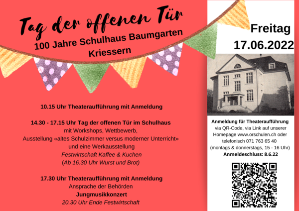Unser Schulhaus Baumgarten wird 100 Jahre alt. Das soll gemeinsam gefeiert werden. In der Woche vom 13. - 17. Juni findet eine Projektwoche für alle Kindergartenkinder und Schüler:innen statt. Als Abschluss der Woche wird am Freitag, 17. Juni beim Tag der offenen Tür das Jubiläum mit einer Theateraufführung gefeiert. Die genauen Zeiten sowie das Programm finden sie auf dem Flyer.