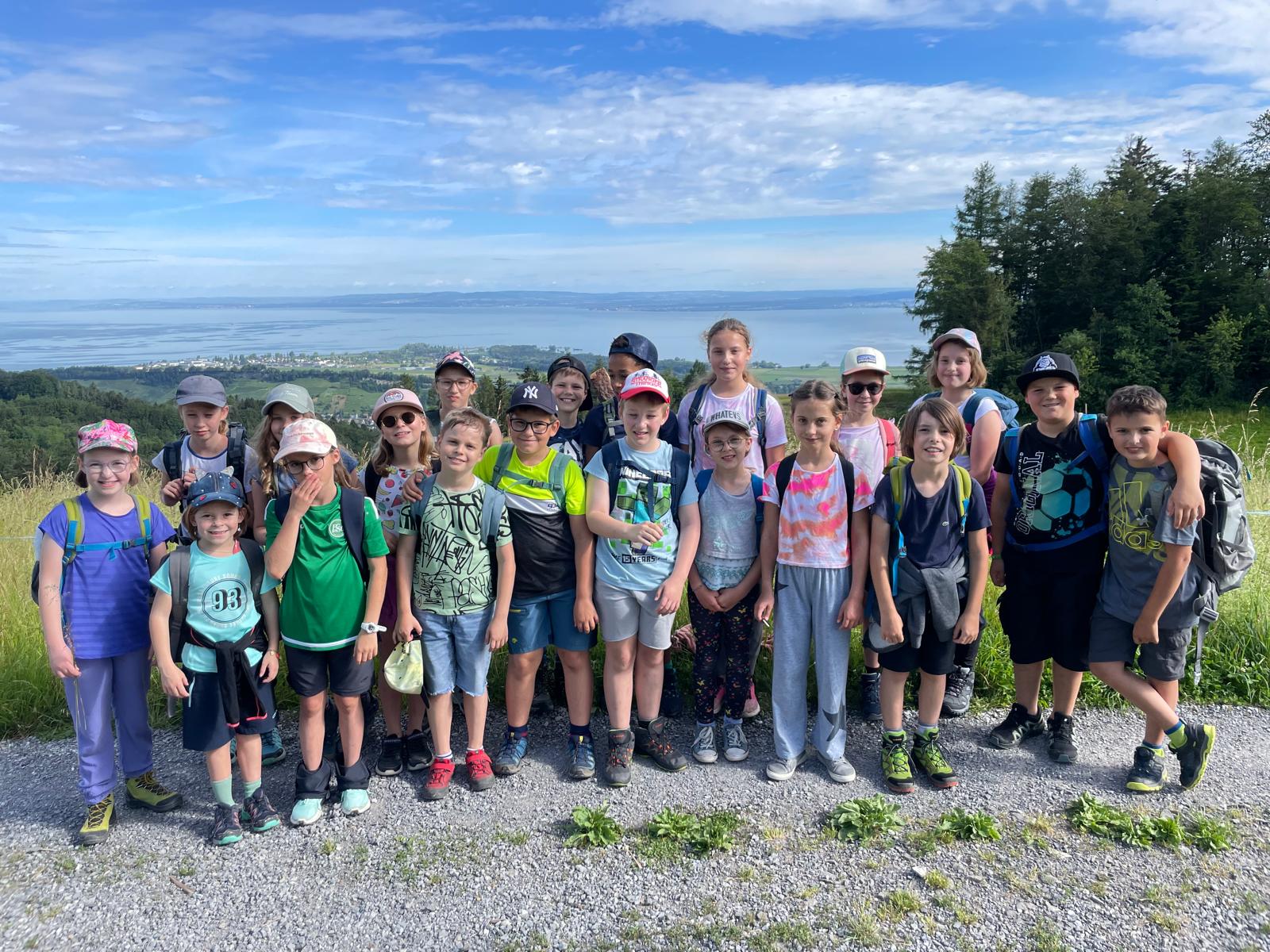 Mit Bus, Zug und Zahnradbahn ging es nach Walzenhausen. Von dort wanderten wir auf dem Witzweg Richtung Heiden. Immer wieder konnten wir die tolle Aussicht auf den Bodensee geniessen. Mittags machten wir im Wald an einer Feuerstelle am Bach Pause. Schnell waren die Schuhe ausgezogen und es wurde fleissig gestaut. Bald war auch das Feuer bereit und wir genossen feine Würste und zum Dessert ein paar Marshmallows. Nach einer weiteren Stunde Fussmarsch erreichten wir Heiden, wo wir mit dem offenen Bahnwagen nach Rorschach fuhren. Wir staunten wie viel Wasser der Bodensee hatte. Mit dem Schiff fuhren wir auf dem See und dann den Altenrhein hoch. In Rheineck stiegen wir wieder in den Zug und kehrten müde und mit vielen Eindrücken nach Montlingen zurück. Weitere Fotos findest du hier.