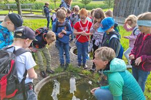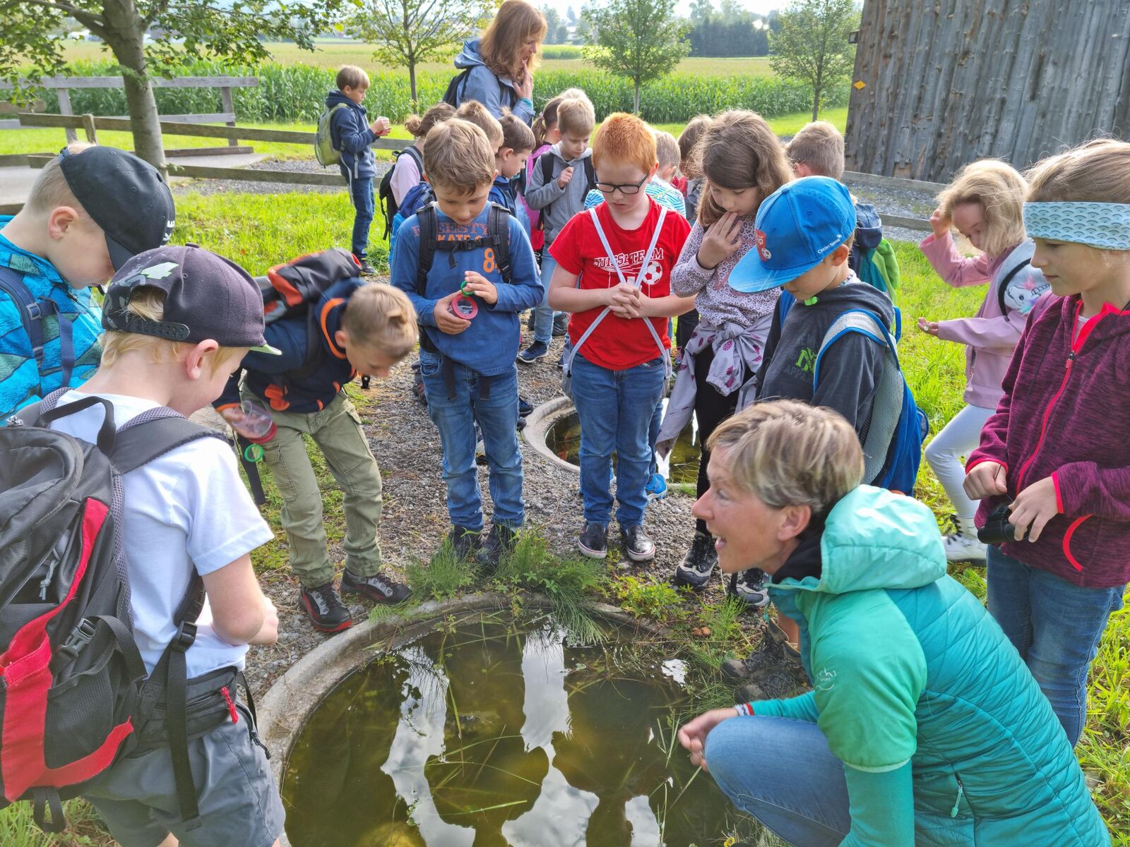 Am Freitag, 27. August machten wir uns auf zum Aueli in Oberriet. Dort trafen wir uns mit der Naturexpertin Barbara Meier. Sie führte uns zu den Wasserlöchern. Dort sahen wir Kaulquappen, Gelbbauchunken, Wasserläufer, Fliegenlarven und Wasserschnecken. Wir entdeckten auch Weinberg- Nackt- und Bänderschnecken. Ein Nacktschneckenpaar hatte gerade Eier gelegt. Danach guckten wir durch ein Fernrohr und beobachteten in den Felswänden des Steinbruchs die Nester der Alpensegler und der Turmdohlen. Am Himmel flogen Mäusebussarde, Rotmilane, Turmdohlen und viele Mehl- und Rauchschwalben. Wir konnten teilweise deren Ruf hören. Frau Meier erzählte uns von der Amphibienwanderung und dem immer kleiner werdenden Lebensraum dieser Tiere. Nach der interessanten Führung assen wir unseren Znüni und machten uns dann wieder auf den Rückweg zum Schulhaus.