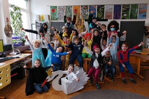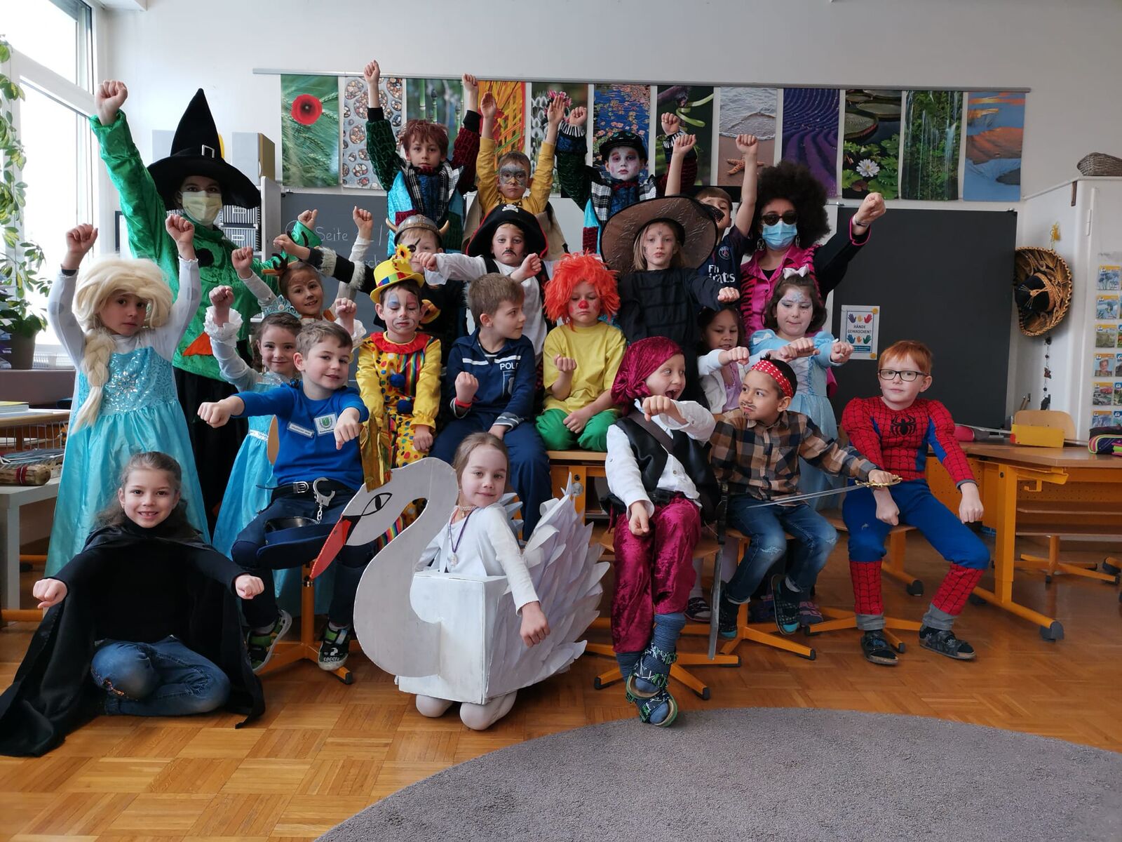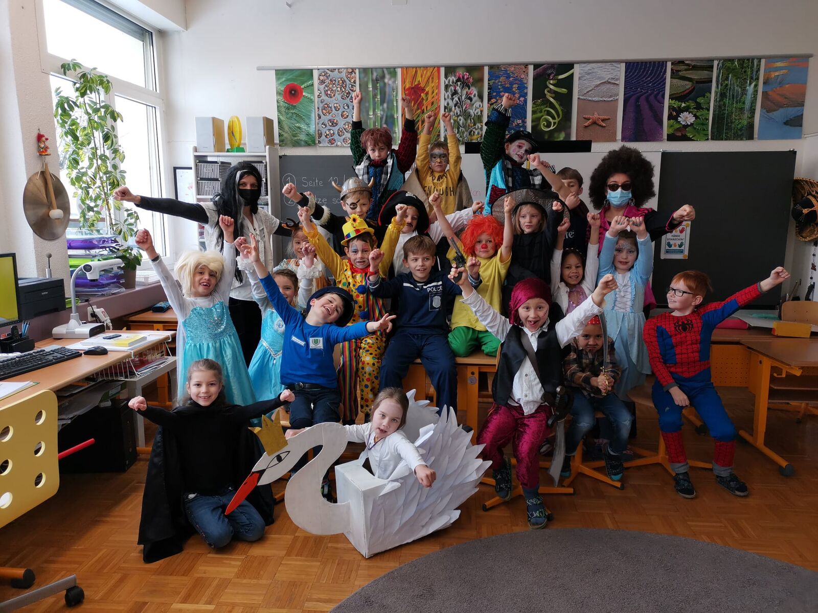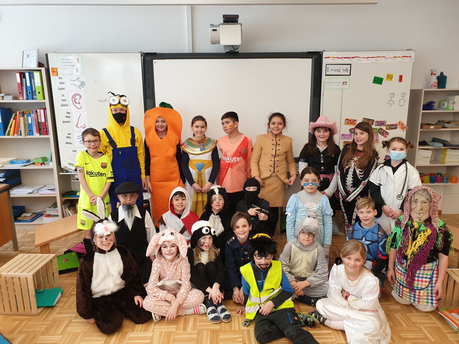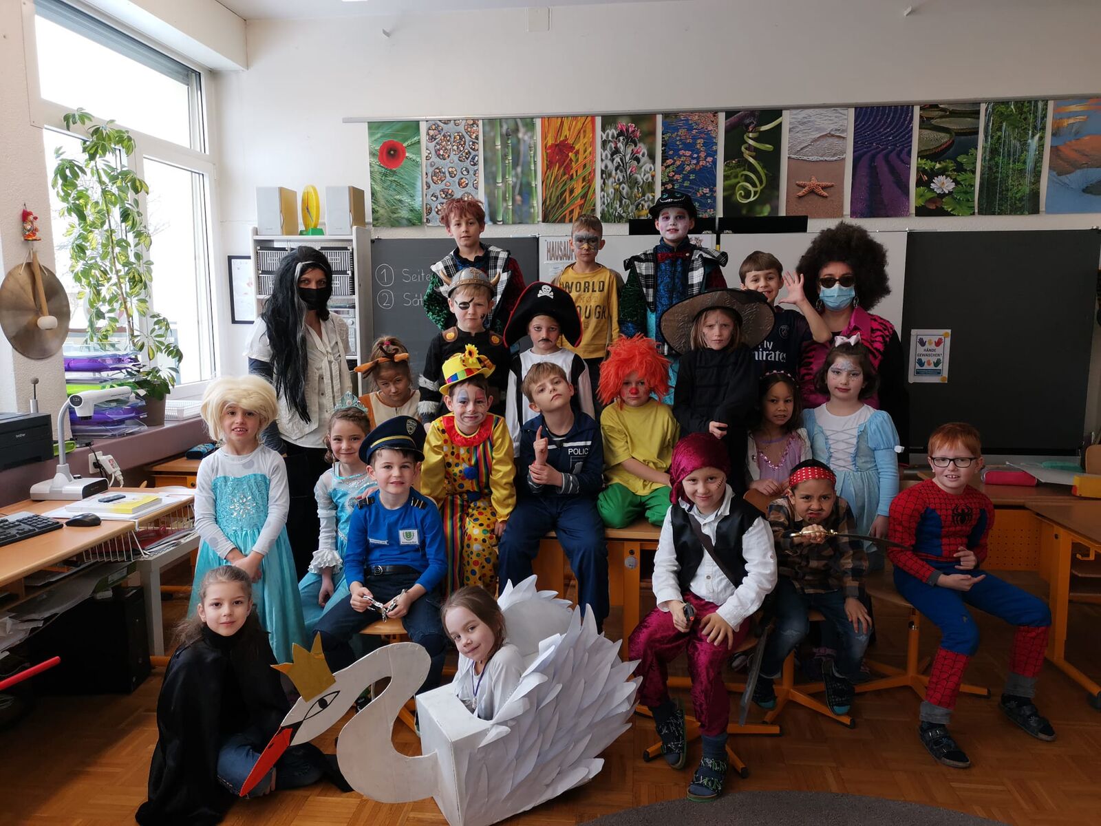 Mit Guggensound, verschiedenen Spielen und Tänzen, einer Modeshow und Liedern haben wir am Freitagmorgen im Schulzimmer Fasnacht gefeiert. Alle Kinder und Lehrpersonen sind verkleidet gekommen und wer wollte, durfte sich schminken lassen.
