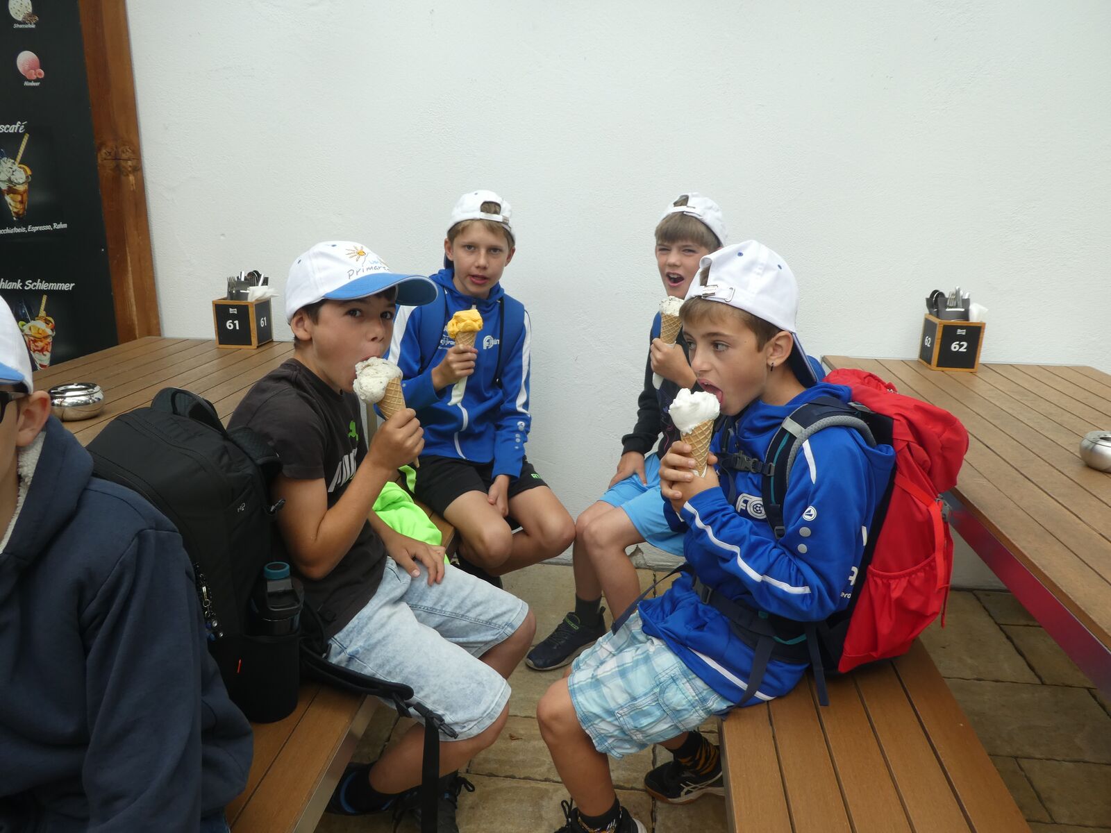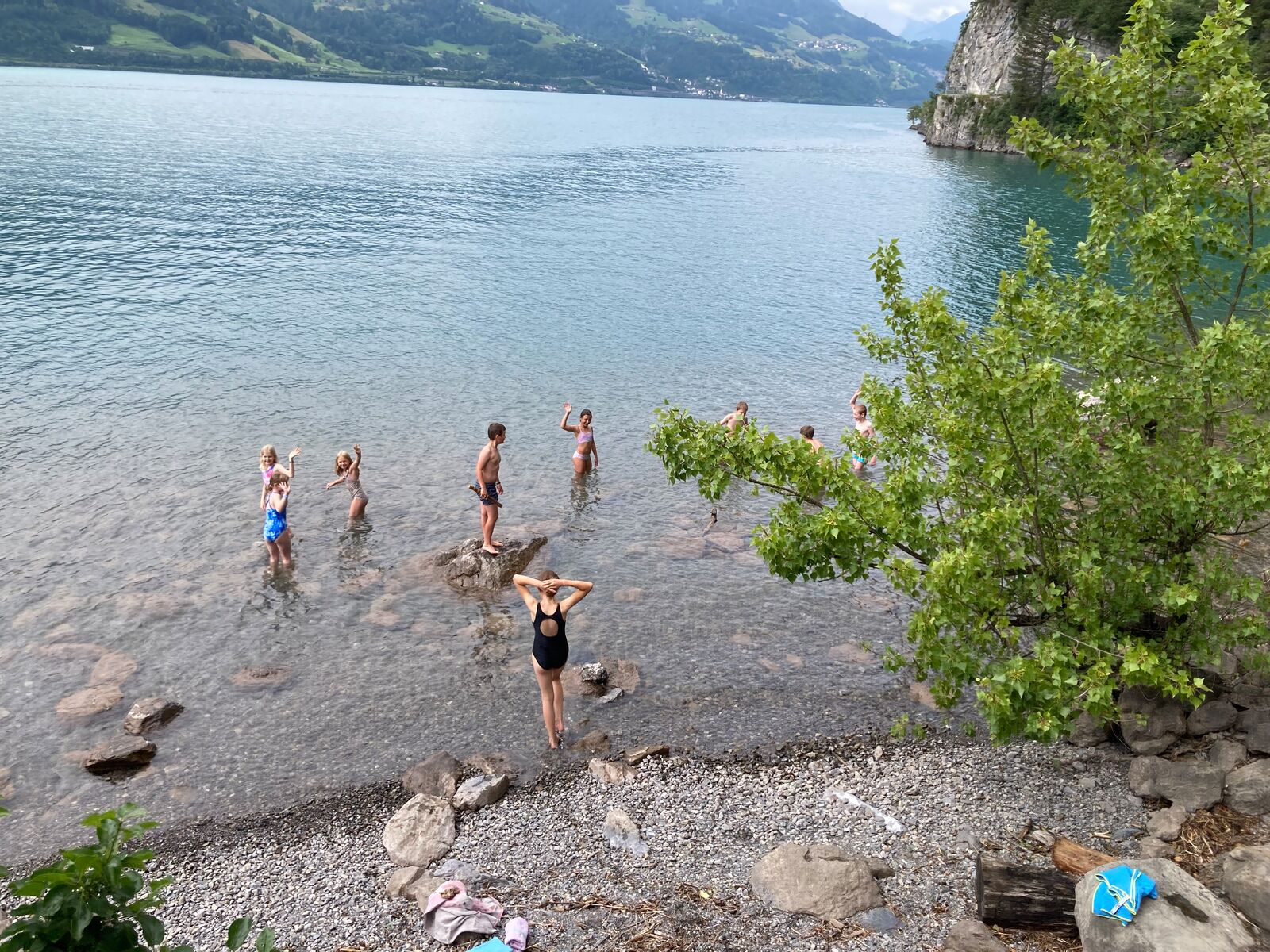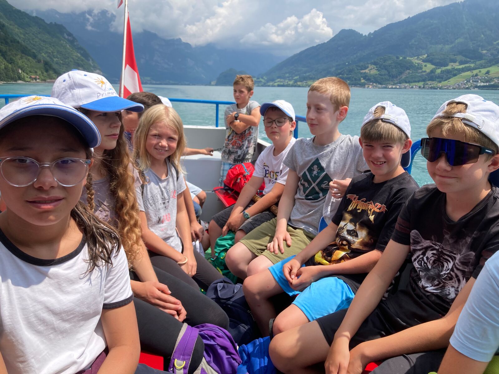 Nachdem wir die Koffer ins Auto geladen hatten, stiegen wir in den Bus. Wir alle sind vor Aufregung fast geplatzt. Am Bahnhof sind wir ausgestiegen und mit dem Zug bis nach Murg gefahren. An einem kleinen Ufer warteten wir ungeduldig auf das Schiff. Ein paar von uns sind, um sich abzukühlen, barfuss ins Wasser gestanden. Als wir auf das Schiff gingen, hatten manche Angst, es würde untergehen. Am Hafen von Quinten spendierte Saras Gotte allen eine riesige Eiskugel im Restaurant Schifflände. Nach dem leckeren Eis liefen wir statt zu einem abenteuerlichen Picknickplatz direkt zum See.