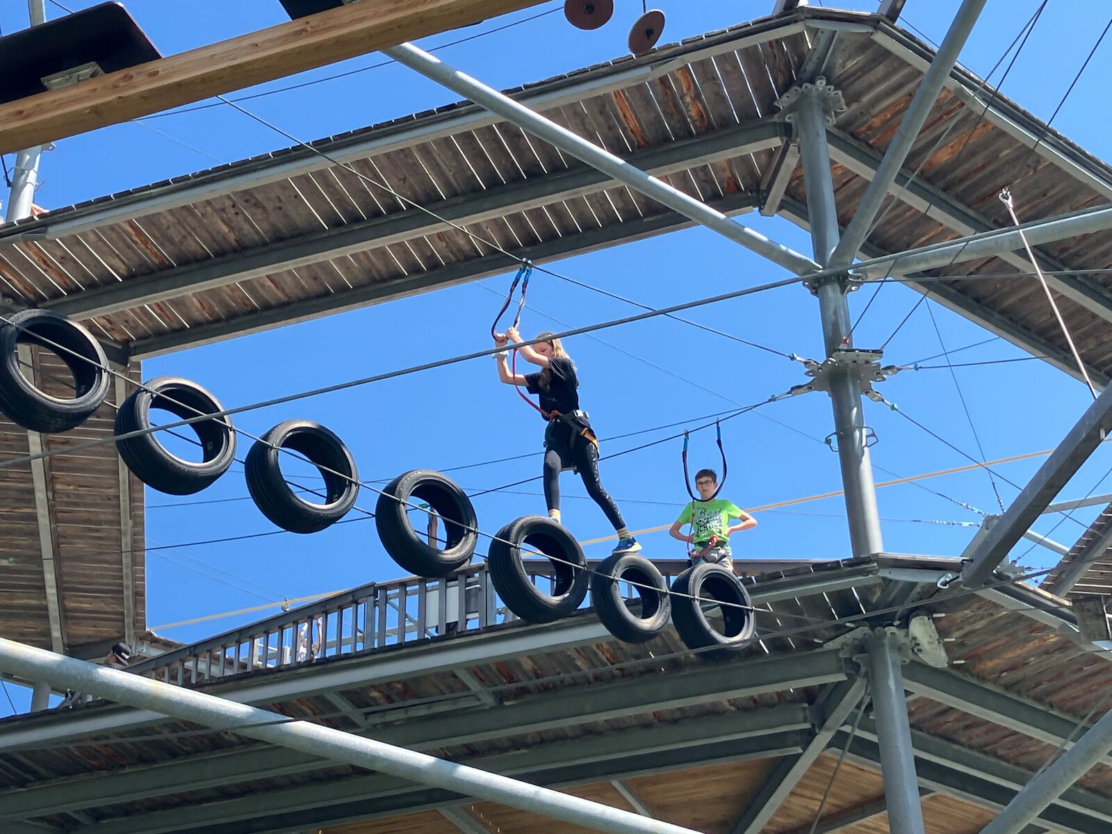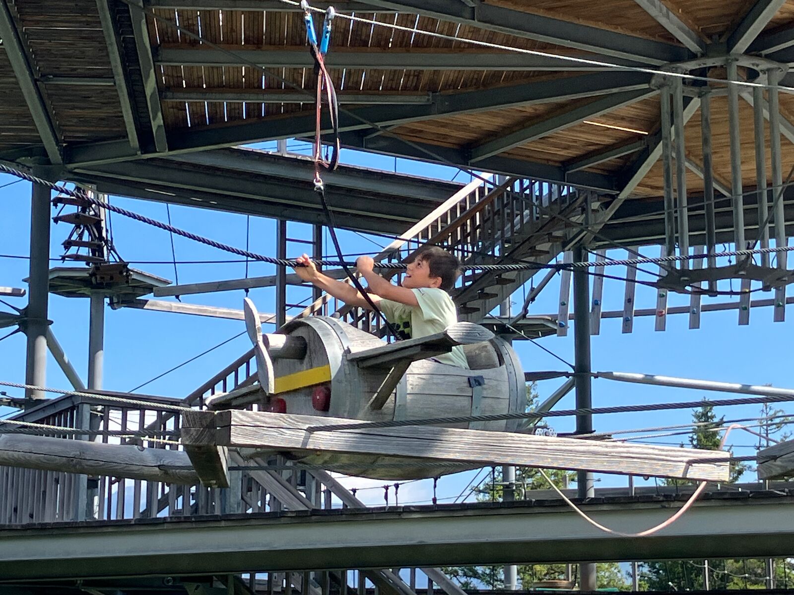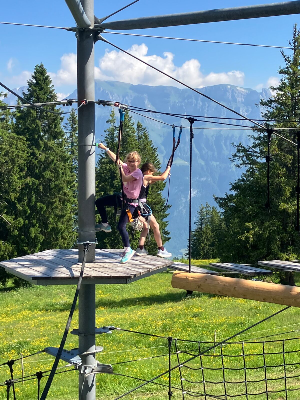 Da wir müde vom Vorabend waren, schliefen die Mädchen heute lange aus. Die Jungs standen um 6:30 Uhr auf. Nach dem Frühstück fuhren wir voller Erwartungen mit der Gondelbahn zum Kletterturm Cliimber auf der Prodalp. Das Klettern, Schwingen und die Zipline waren sehr aufregend. Nach rund zwei Stunden Kletterspass gingen wir hoch zu einer Feuerstelle, wo unser Leiter Roger bereits ein Feuer gemacht hatte. Wir grillten unsere Würstchen und Findus-Plätzli. Nach dieser Pause wanderten wir zurück zur Prodalp und verbrachten Zeit auf dem Spielplatz. Manche haben sich eine Eiscreme gekauft, andere sind auf dem Air-Trampolin gesprungen. Um 15 Uhr trafen wir uns alle wieder und fuhren mit der Gondelbahn zurück zum Tannenboden. Dort packten wir schon mal unsere Koffer, damit wir am nächsten Morgen schnell abreisen konnten. Nach diesem anstrengenden Klettertag mussten noch alle duschen. Zum Abendessen bestellten wir leckere Pizzas, welche dann viel zu spät bei uns eintrafen. Nach dem Abendessen hatten wir grossen Spass am Abschlussabend, welchen die 6.Klässler für die ganze Milkyway organisiert hatten.