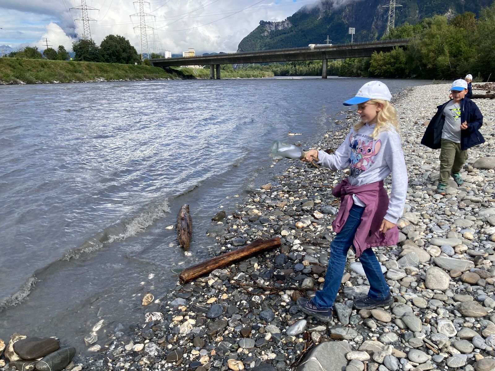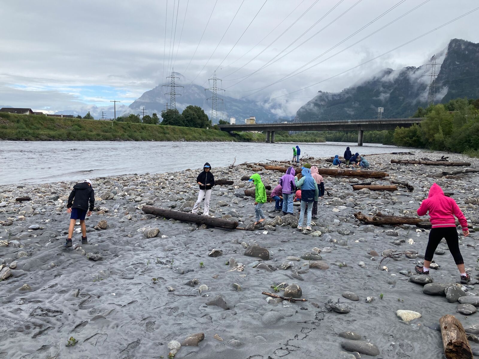 Nach zwei Nächten in unserem Lagerhaus musste nun wieder alles aufgeräumt, geputzt und das Gepäck im Schulbus versorgt werden. Während die einen Kinder die Unterkunft reinigten, spielten die anderen draussen auf dem grossen Platz. Heute besuchte Herr Wohlwend unser Lager. Wir freuten uns sehr, als Herr Eggenberger und Herr Wohlwend mit uns auf die Sandbank auf der gegenüberliegenden Seite des Rheins gingen. Wir fanden mega schöne Steine, Zeichnungen und sogar eine Flasche, welche wir dann als Flaschenpost mit einer Nachricht in den Rhein warfen.