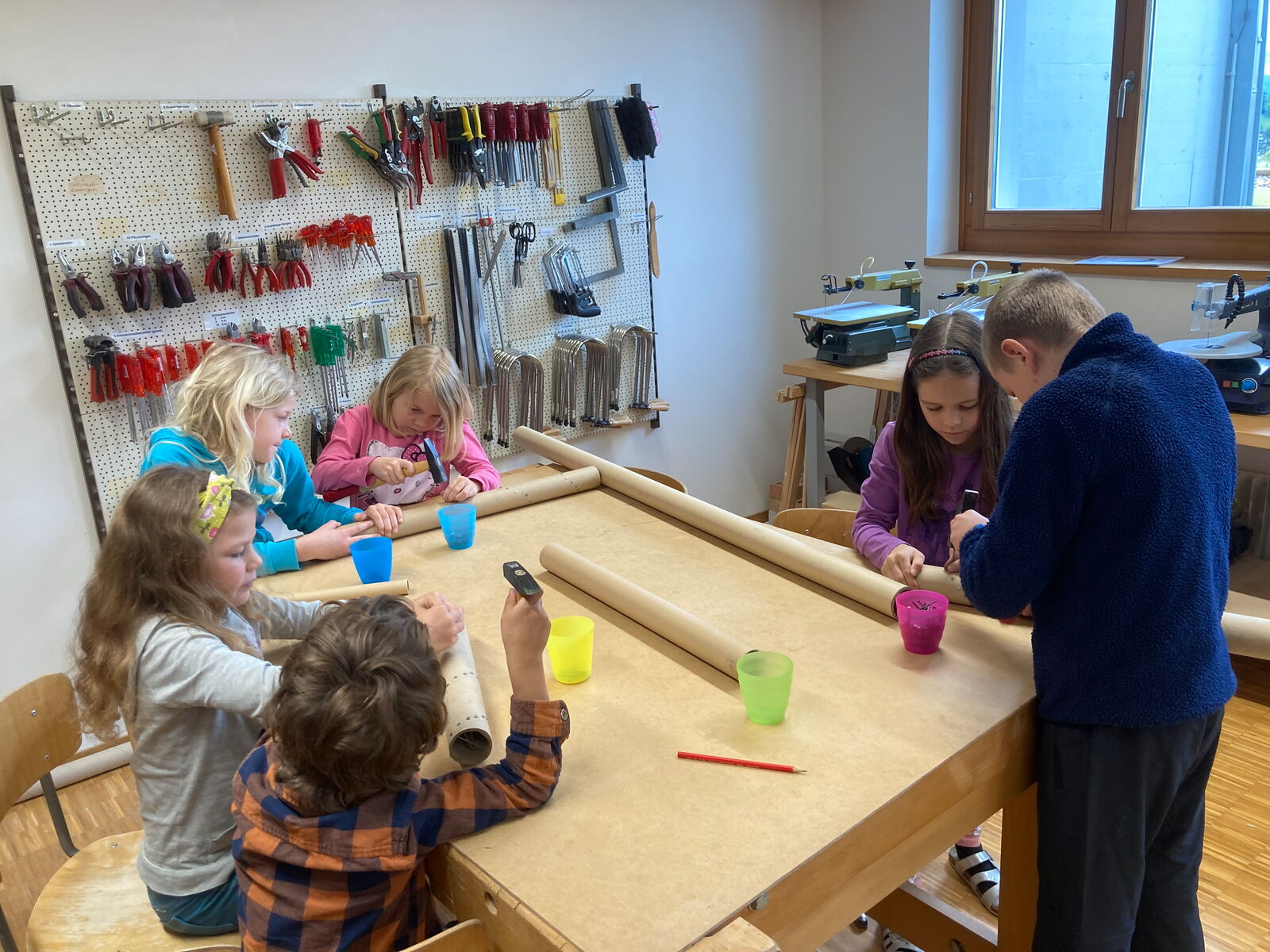 Was passiert, wenn du zwei grosse Kisten voller WC-Rollen und Kartonröhren zur Verfügung hast? Natürlich, es wir gebastelt und gebaut. In einem kreativen Prozess entstanden Alphörner und Rasseln, Maschinen und Fahrzeuge, Stifthalter, Zauberwälder, Einhörner und viele weitere Kreationen.