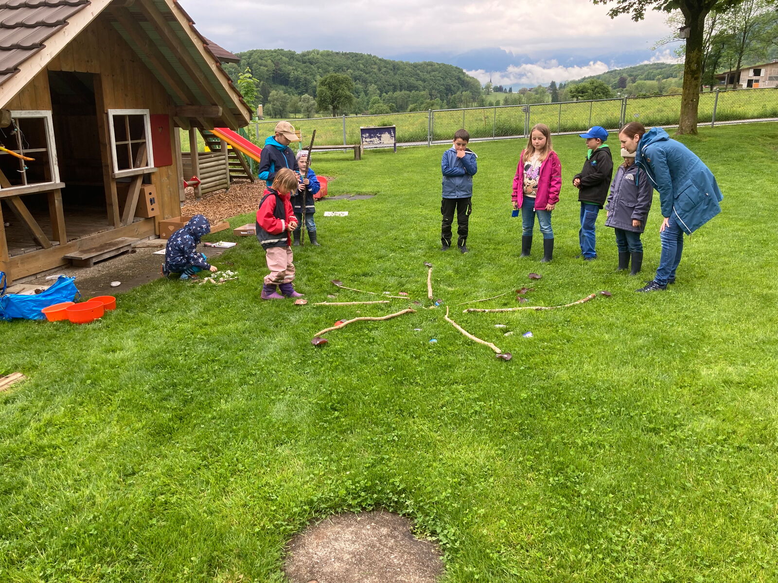 Auch draussen, hinter dem Schulhaus wurden die Kinder zu Künstlern. Aus Schneckenhäuschen, Muscheln und Blumen entstanden kleine Kunstwerke zum Mitnehmen. Die ganz grossen Mandalas und Türme aus Stecken, Steinen und Tannenzapfen wurden auf Fotos festgehalten.