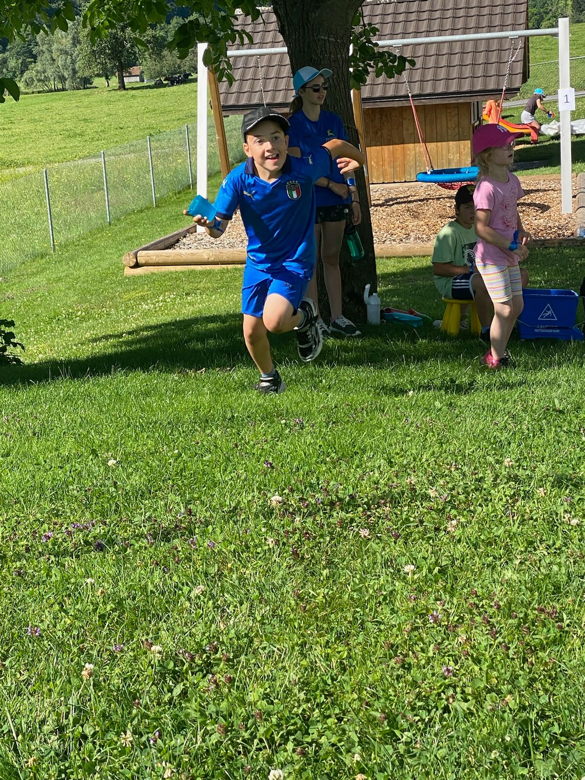 Danach waren am zweiten Posten pantomimische Fähigkeiten gefragt, vereint mit Schnelligkeit. Unter dem schattenspendenden Baum rannten sie den Hügel hoch und versuchten in der Gruppe schwierige Rätsel zu lösen. Beim dritten Posten warteten zwei grosse Paar Ski, auf denen die Kinder zu dritt oder viert eine Strecke meistern mussten. Es war gar nicht so einfach die kleinen und grossen Füsse im gleichen Rhythmus zu bewegen. Auch die Herausforderung,