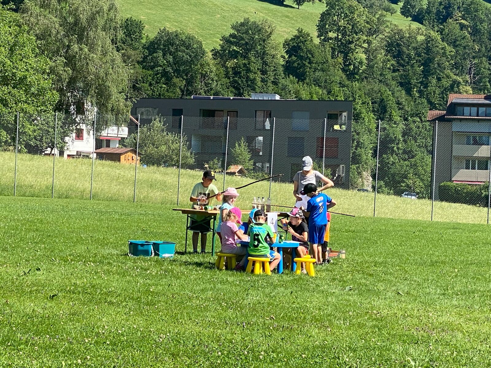 Danach ging es zum vierten Posten, bei dem sie Petflaschen angeln und Schuppen ausmalen durften. Da konnten sie sich körperlich etwas erholen. Schwierig und spannend blieb es aber trotzdem. Auch beim fünften Posten konnten Gross und Klein glänzen. Die Golfbälle an der Schnur genau an den richtigen Stab zu werfen, haben die Kinder grossartig gemacht. Bei jedem Treffer gab es einen Wasserbecher zur Belohnung. Natürlich waren die Anforderungen zum Werfen auf das Alter der Kinder abgestimmt.
