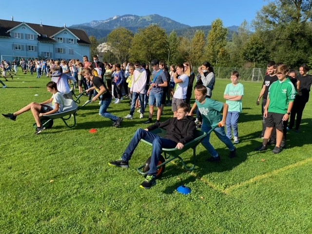 Auf die Plätze, fertig, los! Mit der Schubkarre über den Pausenplatz.
